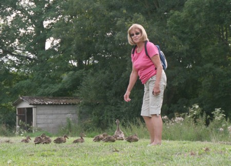 Françoise recueille un vif succès auprès des canetons qui ont nagé jusqu’à l’écluse