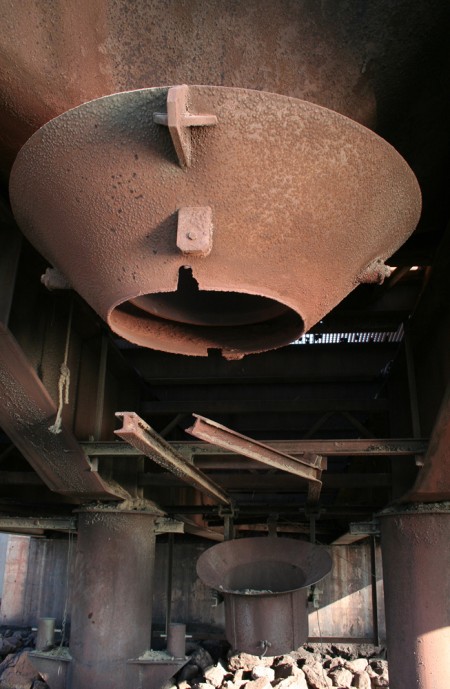 Comme la goulotte n’est pas du tout au milieu, si on veut avoir le bateau droit, on doit  écarter l’arrière du bateau au moteur, pendant que la bauxite tombe, sans trop voir, à cause de la poussière, et en essayant de revenir vite si besoin malgré le vent, ..plus pratique, tu meurs